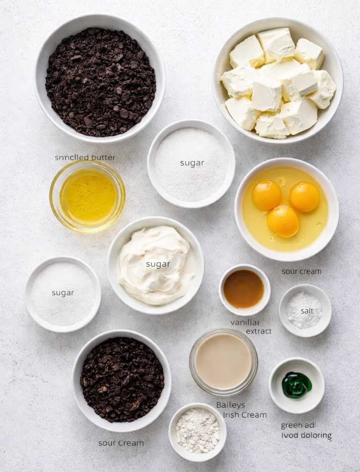 3. In a large mixing bowl, beat softened cream cheese until creamy and then add in sugar and mix well. One by one, add in eggs and beat until each is incorporated before adding in the next one. Add in sour cream, salt, vanilla, all purpose flour and Baileys and continue mixing until you have a creamy filling. Transfer 1 cup of cheesecake filling evenly into two separate bowls and add light green food coloring to one bowl and regular green food coloring to the other. Mix the food coloring into the batter to combine.