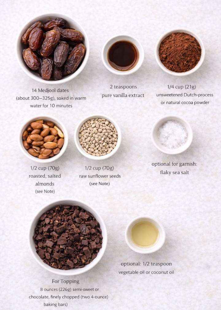 Healthy Chocolate Date Truffles rely on ingredients that already make sense in everyday kitchens. I start with soft Medjool dates because they bring natural sweetness and a creamy texture without added sugar. Cocoa powder adds that deep chocolate flavor I crave, especially on days when dessert feels non-negotiable. A small amount of nut butter or finely ground nuts gives structure and richness, while coconut oil helps everything come together smoothly. Each ingredient plays a clear role. Nothing feels extra. This is the same approach I use in many naturally sweet recipes shared on Not Just Recipe, including other no-bake treats that focus on real ingredients instead of shortcuts.