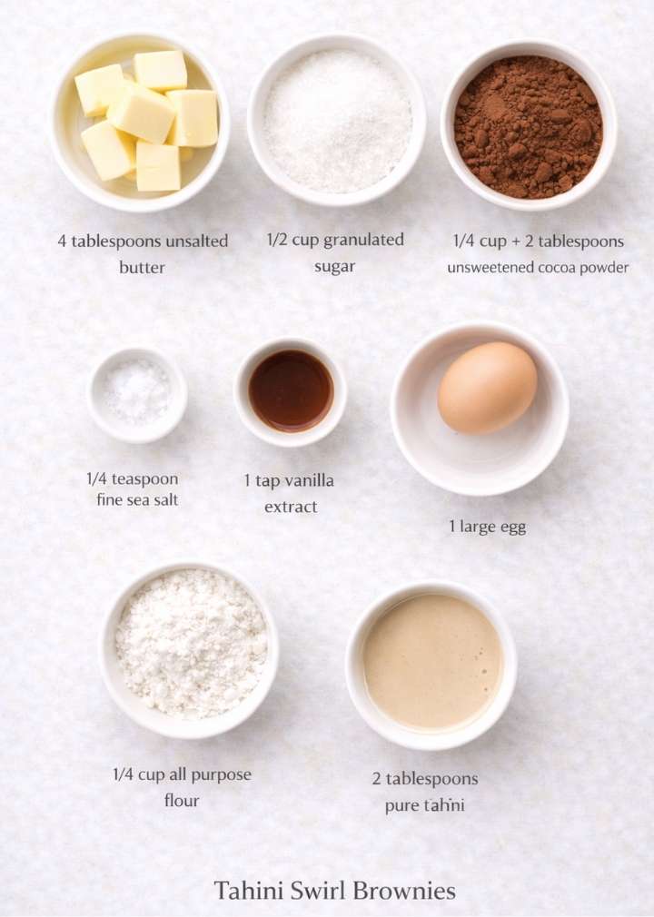 Tahini Swirl Brownies rely on simple ingredients, yet each one plays a clear role. I learned early on that quality matters more than quantity. Because brownies don’t hide flaws, every choice shows up in the final bite. That’s why I stick to unsweetened cocoa powder with a deep chocolate tone and tahini that pours smoothly, not stiff or dry. When both ingredients work together, the brownies taste balanced instead of sharp.