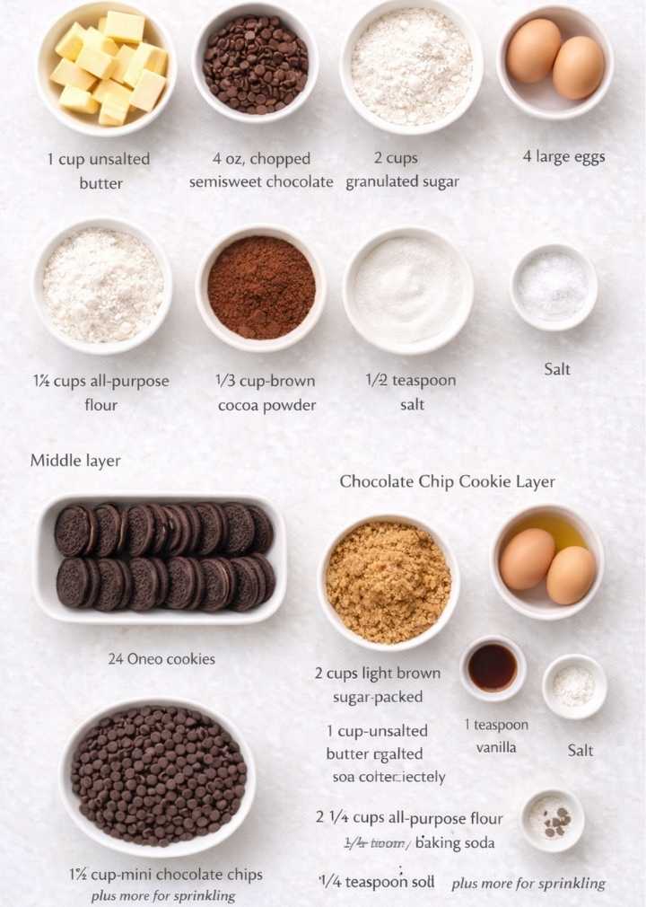 Layered Oreo Brookies – a triple decker treat of fudgy brownies, a layer of Oreo cookies, and a chewy chocolate chip cookie topping. Baked in a 13×9 inch pan, these indulgent bars are perfect for sharing.